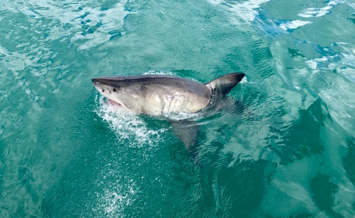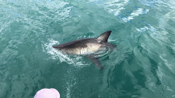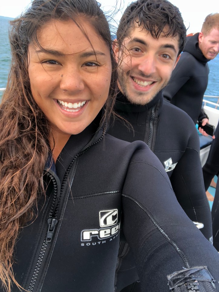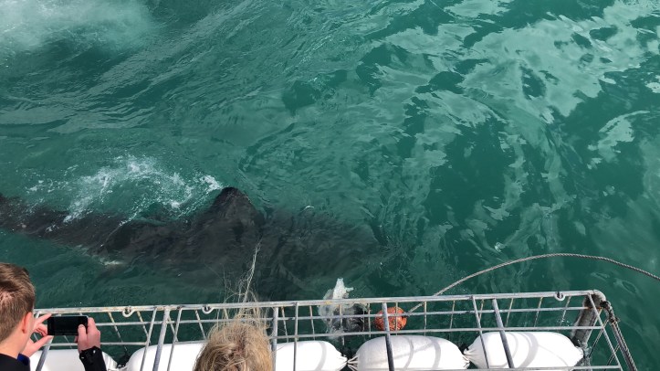 Okay, now to the good stuff: my experience with the amazing great white sharks. We got out to the spot where sharks had been spotted in the morning.  The lead biologist of the company, Brian Mcfarlane, was in contact with other tours to find where the sharks were. I can highly recommend this company, Great White Shark Tours, which you can book here. They offer a money back guarantee if you do not see sharks which is a huge plus, and he has a very high success rate to find sharks.  Anyways, we were told the early morning boats saw two great whites, so I was so excited to hear that they were in the area. We anchored right next to the boat (who would be leaving shortly) and we got suited up.  Of course I got my wetsuit on in record time due to my excitement of getting in the water, so we were able to be the first group to enter the cage and witness this incredible animal from under the sea. This was SUCH a cool experience.  Within 15 minutes in the freeing cold water, we got three close up encounters with the large animals. There were about 30 people in total on this boat, and the cage fit 8 so we had four rotations. But it was perfect because the views from the boat were just as amazing.  The visibility under the water was less than 2 meters, so the shark had to be super close for us to see. The workers on the boat used a seal cutout as well as chum to attract the sharks closer to the cage. In the end, I rotated into the water three times, seeing the sharks on many occasions.  I even lucked out and got to see the rare copper shark, also called a bronze whaler. By the end of the day, we saw a total of seven great whites, which was a record for the entire year. So we definitely lucked out! Just check out these photos!