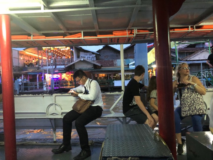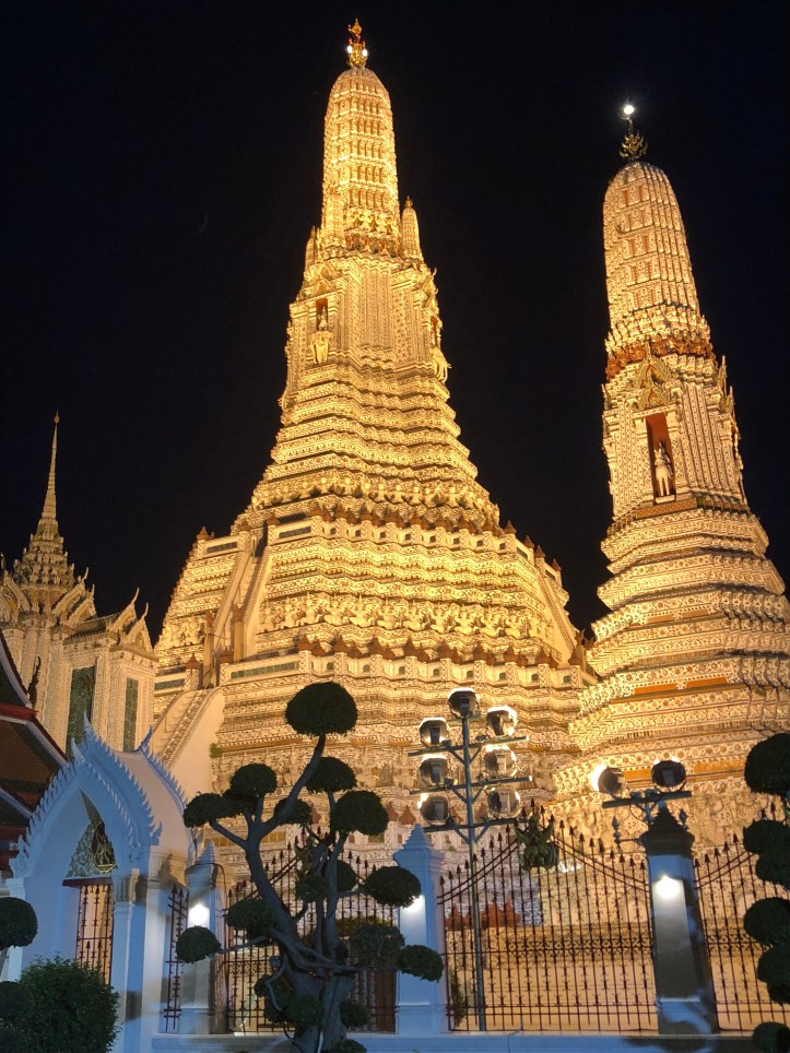 At around 3:30 I hopped in my taxi and headed back to Bangkok. There was quite a bit of traffic once we got near the city, so I asked my driver to drop me off about 30 minutes before my hotel so I could explore downtown Bangkok in the evening. I didn’t have much time and wanted to see some highlights, so he dropped me off right at the grand palace. Unfortunately I couldn’t go inside because it was closed after five, but I walked around and eventually came across a water taxi along the river. I hopped in and paid like 12 cents to cross the river to a beautiful temple that was lit up.