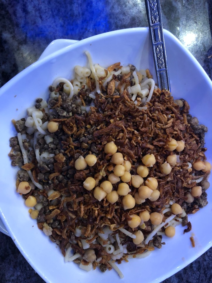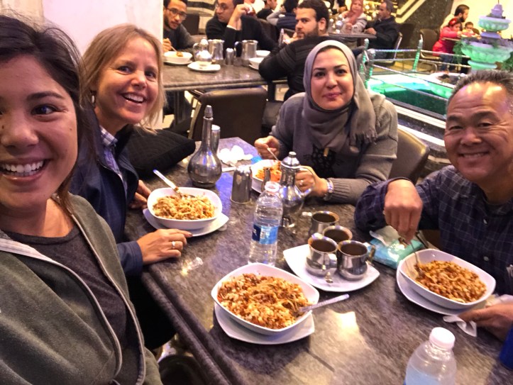 It was about 7 by the time we finished enjoying the views (due to long lines) but afterwards we went to a wonderful Egyptian restaurant that served just one meal, called koshary. YUM! It was a mix of rice, pastas, lentils, chickpeas, fried onions, with spaghetti sauce and vinegar. Sounds like a strange combination but I enjoyed it. The restaurant name was Abou Tarek, it is a well known place by the locals and I highly recommend it.