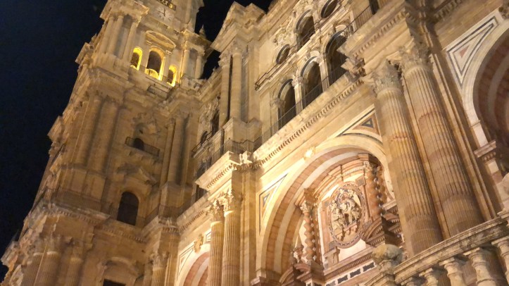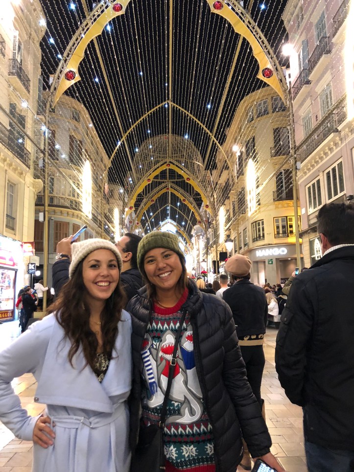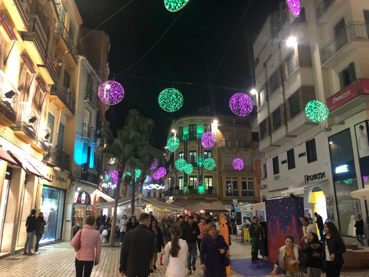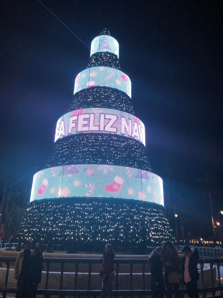 I had a delicious meal of vegetarian Spanish rice (I’m blanking on the same) with an avocado salad, bread, and sangria. It was sooo good. We ended up having a similar meal many times on this trip but I am a fan so it’s fine with me! After lunch we took a quick look at the ocean before heading into central Malaga to check out the Christmas festivities. It was December 16th so the lights and markets were attracting visitors from around the world. We took the public bus about an hour, and found the location quite easily since it was just the last stop. We arrived at the perfect time, and at around 8:30 they started the light performance right when we got there. There’s one street with a canopy of lights near the historical center of the city. And a few time each evening they had a synchronized light show that went along with some Spanish Christmas music.