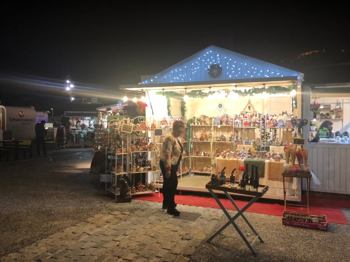 It was magical and super happy. After the light show, we headed over to the harbor area that had the Christmas markets. I wish the US had these too, where local vendors would set up seasonal shops just before the holidays. It was super nice! They had all kinds of goods, like jewelry, clothes, meats, plants, and bags. In the middle was an arrangement of Christmas trees which were lit up, and even some fake snow. It was so cute and even a bit cold so I was finally feeling like it was Christmas.