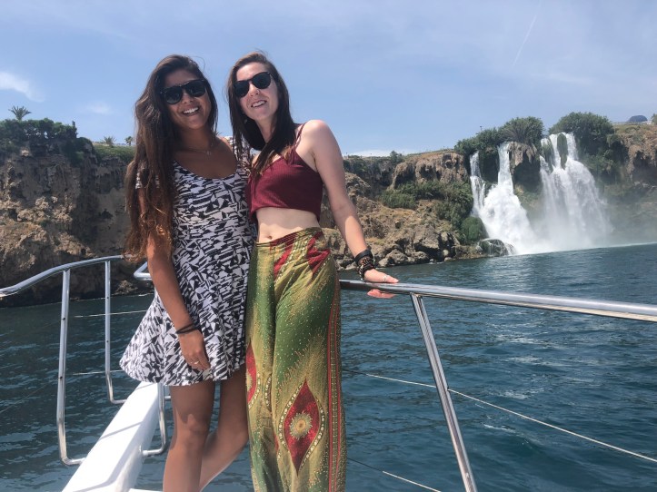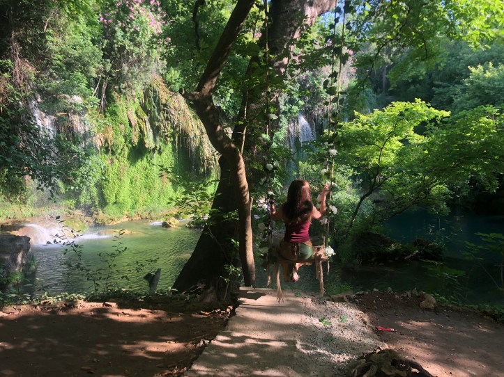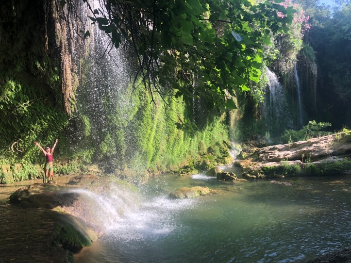 Day two in Turkey we woke up bright and early. At around 6 am we departed the hostel to find a taxi to take us to a nearby bus station. The taxi was easy enough to find, but unfortunately once we arrived at the bus station (Medan) we asked around and couldn’t find the bus that was recommended to us by the Turkey Tourism lady the day before in Antalya. We got more instructions to take a tram to Kursunlu, and then find a bus to there. We figured we might as well try, so we got a tram/bus card for 12 lira ($2) and we were on our way. Once we arrived in Kursunlu we were so confused on where to go, as there were no bus stops or stations. Fortunately, we found a tram worker who had google translate and we were able to find out what we were supposed to look for a small bus, number 81, who could bring us to the waterfall. We stood on the main road and got ready to wave down the bus. Fortunately, about 10 minutes later it passed and we got on. Our tram cards worked and paid for the trip! It was about 20 minutes until we arrived at the park, and we were the first ones to arrive. Gates opened at 8 am and we got there at around 7:50, so we waited on the benches until they gave us the go ahead to get in. I am super happy we went early because we had the whole waterfall to ourselves. The park was absolutely beautiful, never would have expected such a gem. The waterfall was pretty wide, and there was a little area where we could even stand underneath it. It was absolutely spectacular and I highly recommend. There were beautiful pink flower trees and the water was a beautiful turquoise color, and having it to ourselves was truly magical. I highly suggest coming here early so you can experience it.  After the waterfall you can follow a little trail that took us maybe 20 minutes to complete, and it brought you back to a second series of smaller waterfalls.  I’d recommend this because it was easy, and being in nature right outside of a city is so special so you might as well enjoy the tranquility while you are here!
