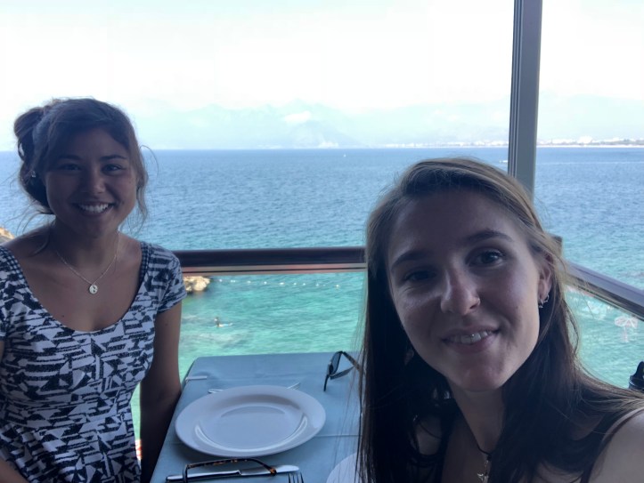 We spent about two hours total at this park, taking a rest to enjoy the views and have a snack, as well as taking many photos. We had somewhat limited time since we wanted to do two other waterfalls the same day.  If we had time I would have loved to have a meal in the café that was overlooking one of the smaller waterfalls, it looked beautiful. We wanted to be at the marine in Antalya by 12 or earlier to book a boat to Lower Duden waterfall, so we asked the man working the front desk about the best way to get there and he told us we could take the bus that comes every half hour. A taxi man waiting outside the park told us that he could drive us, and at first we said no thank you, since we wanted to save money.  But then we looked at the time (10:40ish) and we figured that getting back might be tricky so we bartered the price down and we were on our way in the taxi.  It was perfect because it cut down a lot on time and we were able to have time to talk to the people selling boat trips and barter on a price before grabbing lunch.  The day before we walked around the area and saw a cute set of cafes and restaurants with beautiful views.  It was called Mermerli Restaurant, and it overlooked a beach down below with crystal clear Mediterranean water.  There was mostly Italian food on the menu, so we both got vegetarian pasta dishes and then shared them.