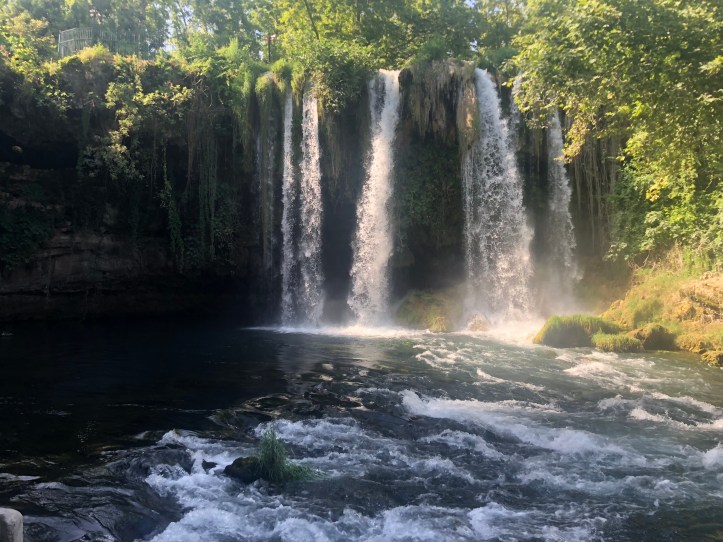 Upstream of Lower Duden waterfall is a more visited park called Upper Duden, which can also be reached by public transport.  We walked from the harbor to a bus station called Dogu Garaji.  We tried asking around for a bit and finally found a kind Turkish man who had an app with all of the routes and listed our possibility.  A bus pulled up which said “Duden” and he pointed and said it was correct, so we hopped on and we were on our way.  We found the bus drivers and most people on the bus to be super helpful and telling us where to get off, although most people didn’t speak English. This waterfall was a lot busier than Kursunlu, although the park itself was smaller. You only had to walk a few minutes until you heard the rushing sound of the falls.  This one wasn’t as lush and tropical looking as the other but it was taller with more water, it was super impressive and beautiful.  A really cool aspect was that we could walk on a path into the cliff and literally get behind the waterfall.  It was wet but super cool!  Highly recommend.
