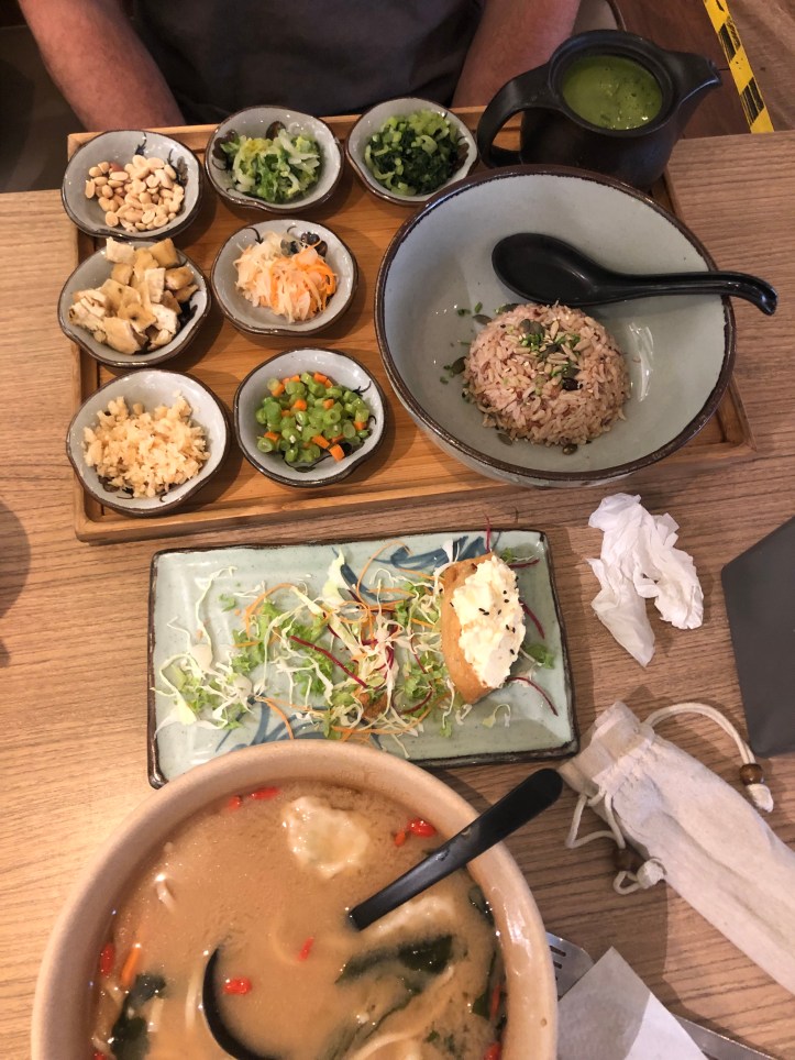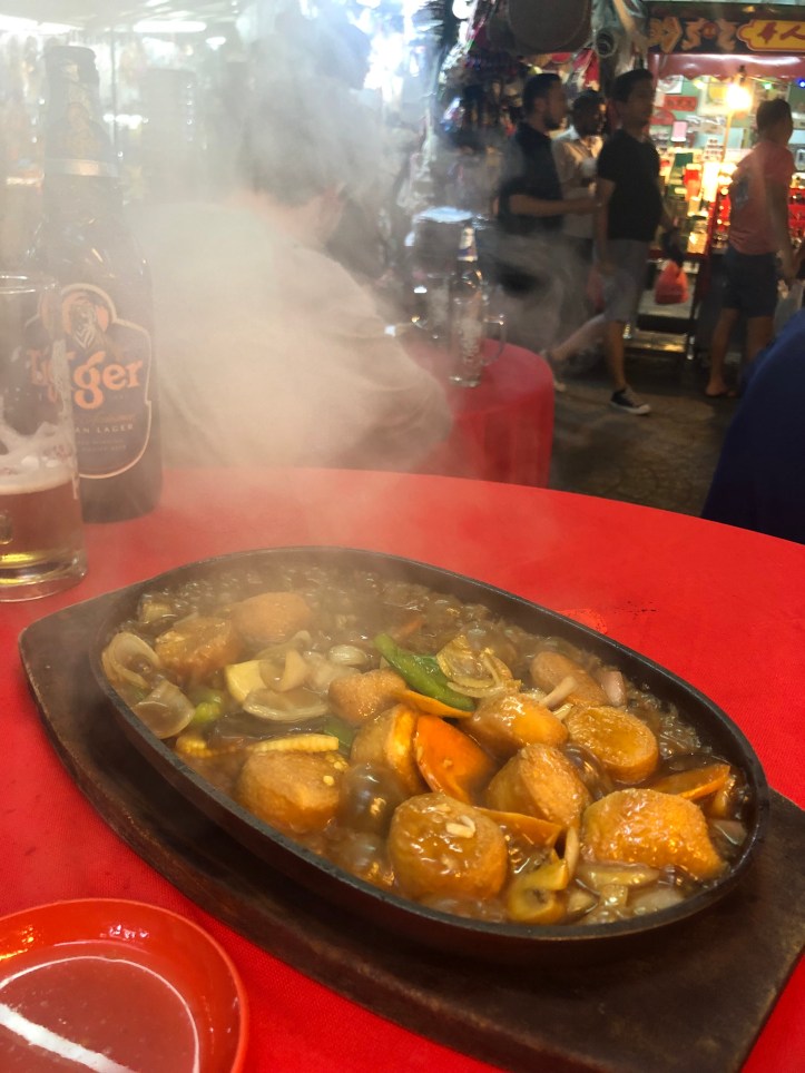 David and I spent a few nights in Kuala Lumpur before he had to return to KAUST. We found an apartment on booking.com which had a fabulous location and incredible views. We hired a driver through the apartment who had the key and showed us how to check-in, unfortunately, there was a lot of traffic so it took a little while for us to get there. We unpacked and settled a bit and then decided to walk around. To get around Kuala Lumpur we took the free bus system, grab, as well as walked a ton. This first night we went to Chinatown using the free bus. The Kuala Lumpur Chinatown was pretty massive, with lots of people and a lot to see. There were a ton of restaurants, and we were pretty ravenous so we found the first one that looked like it had decent vegetarian options. This restaurant was way more expensive compared to our favorite veggie restaurant in Miri, but I guess that prices were just a bit higher in the city. It wasn’t expensive at all- maybe $5 per dish compared to $2. We had veggie rolls, beer, and a tofu veggie dish. It was a cool atmosphere and a great spot to explore and eat.