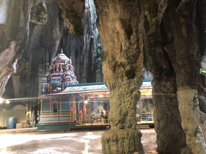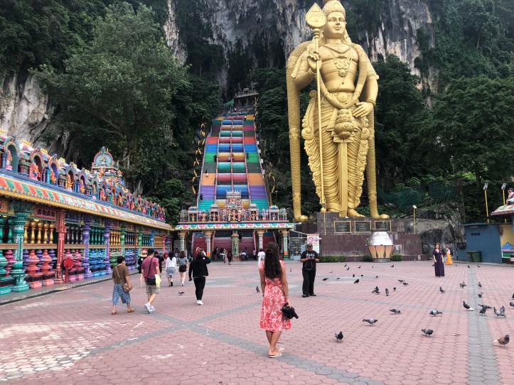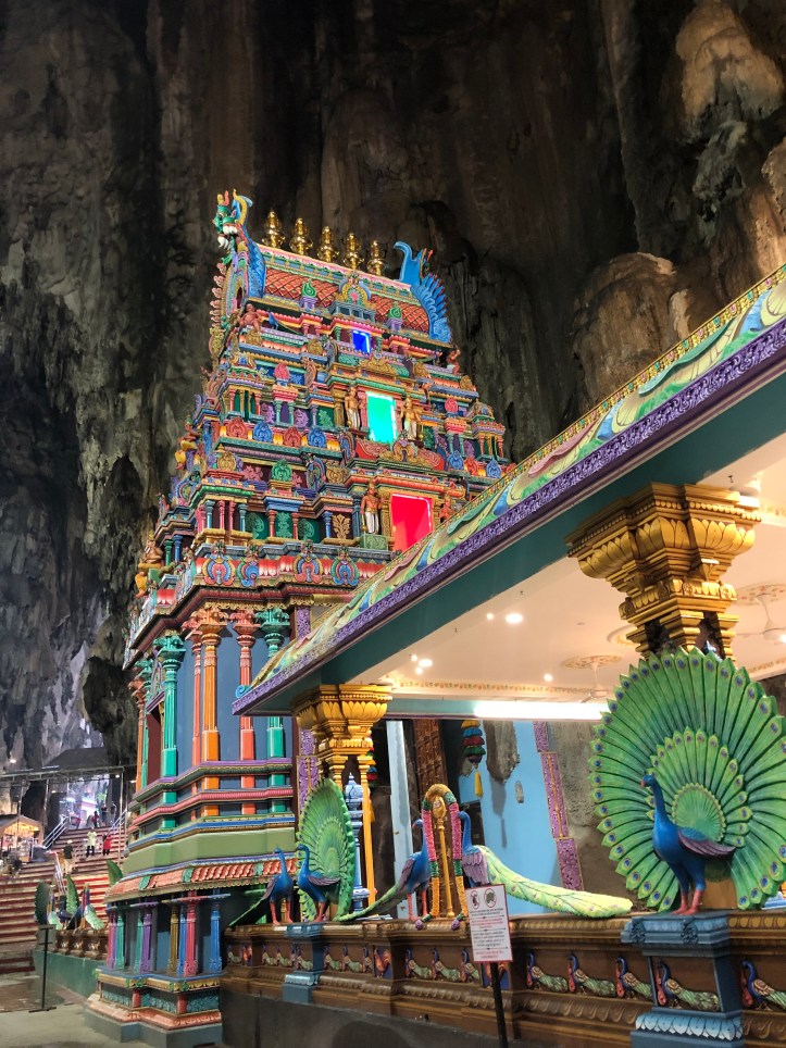 The next morning we woke up bright and early to try to get to the Batu caves before the crowds. We hired a grab, which was pretty cheap ($5ish to take us a half-hour out of the city). This temple was definitely a highlight for me, it was gorgeous with amazing colors. We lucked out and when we arrived it was super quiet. We climbed up the stairs and were in awe by the beauty. At the top of these brightly colored stairs is a massive cave, where inside there are several different temples. When we went there was beautiful music playing, and they were worshiping. There is an opening on the top of the cave, resembling a giant skylight. Birds were fluttering about overhead and it was a really beautiful sight. There were also some monkeys running around in the temple area. There were two main temples, one requiring taking even more stairs, so you can imagine just how massive this cave was. It’s hard to describe how majestic this place is, so I’ll just post some photos to show you.