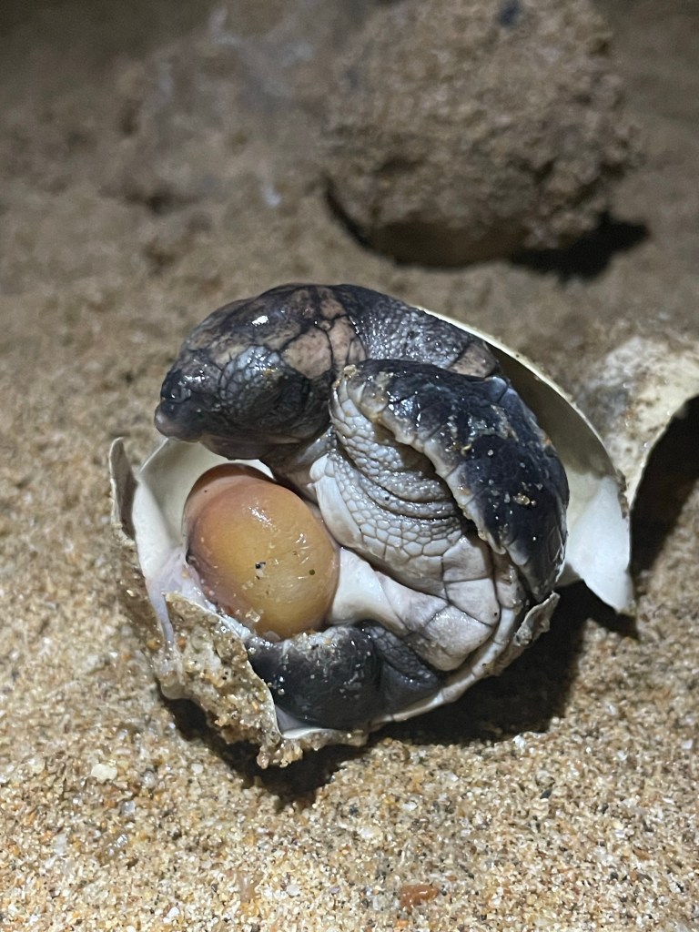 We were heading to Bundaberg, where we would be staying for our week of training. The day we arrived we checked into our cute motel, and then headed to the supermarket for some snacks and bought a sim card (only like Australian $10 for 40 gb of internet, amazing deal). Then we headed to the beach for a refreshing dip, which felt amazing. At around 3 pm Taka picked us up and drove us to Mon Repos where he showed us around and we got a feel for what we’d be doing the next week. We were being trained but we were also helping out with ongoing research. Every day we would arrive at 3 to start with nest excavations while the sun was up. Excavations can be pretty disgusting, but are important to assess hatching success. Excavations occur 2 days after the hatchlings emerge from the nest, and we dig until we find the hatched eggs, which we take out of the nest to determine how any hatchlings developed and hatched, leaving behind an empty eggshells. Unfortunately, often instead of empty shells we find eggs with dead embryos inside. We open them up to determine which phase they died in. We split these into give categories, ranging from undeveloped to fully developed (When the hatchlings is larger than the yolk sack. Sometimes these eggs can be pretty disgusting and full of maggots, so after day one I brought gloves to make it a bit easier.