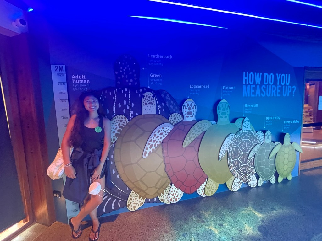 I also was super impressed with the education center at Mon Repos. Apparently, it was a $22 million project, and the center is brand new and so beautiful. There are tons of hands on educational tools for kids (and adults). For example you can use VR to dive the Great Barrier Reef and see turtles and dolphins and fish. You can scan different “bubbles” to see different steps in the turtle nesting process. They have hatchlings and nesting turtles projected on the floor, moving in the same speed and in the same size as real ones. And there is an educational movie about the nesting beach. It is the coolest educational center I have ever seen. Also, each night there are tours showing the community and visitors nesting turtles and hatchlings. Apparently, the whole season gets filled up very fast because there is such a high demand. They maximize the number of people who can be in a single group and not disturb the animals. They have it very well thought out and it is super impressive, highly recommend visiting if you are ever in Queensland.