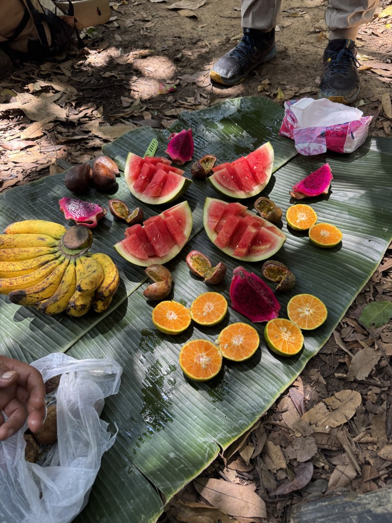 Later, we stopped for a break, and our guides pulled out an amazing spread of fruit from their backpacks—pineapple, watermelon, dragonfruit, passionfruit, snake fruit, and more. It was beautiful and delicious. But of course, it also attracted some wildlife—long-tailed and pig-tailed macaques were eyeing our snacks the entire time.