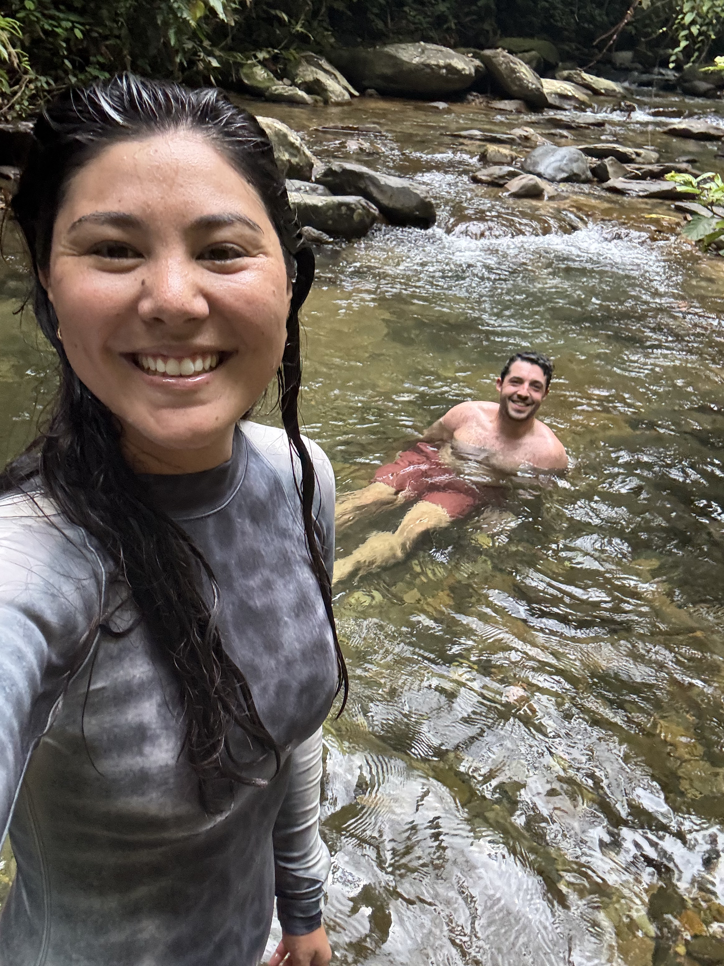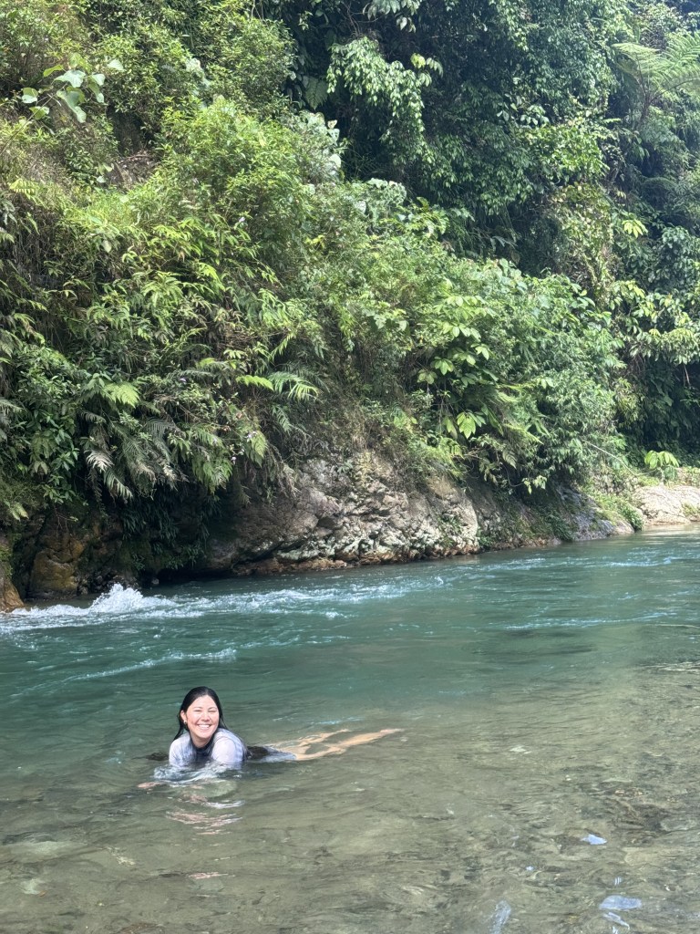 After a thousand more pictures, we began the final descent—tricky terrain with ropes again. But the thought of that river swim kept me motivated. When we arrived, the water was even more stunning than I remembered—crystal clear with the jungle as a backdrop. I ran to change into my swimsuit.