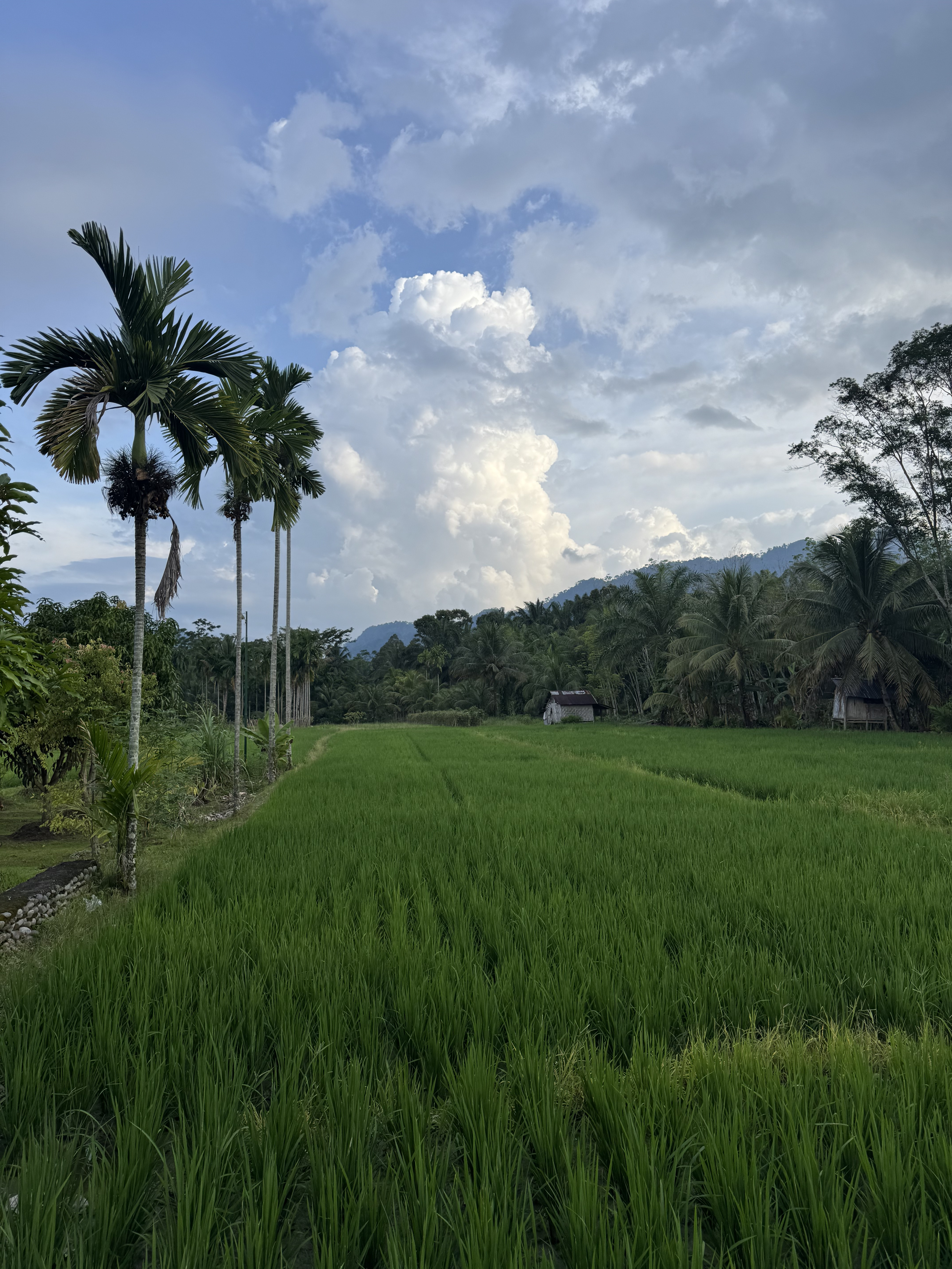 After tubing, we had a short 30-minute walk back to the hotel. We stayed with Sumatra Orangutan Treks, and I can’t recommend them enough. The team was incredibly well-organized and communicative, and the hotel and food were amazing. For our last night, we even got a villa upgrade in the middle of a rice terrace—so beautiful. That afternoon, a thunderstorm rolled in, and after showering, we sat on the porch with snacks, watching the storm roll across the fields.