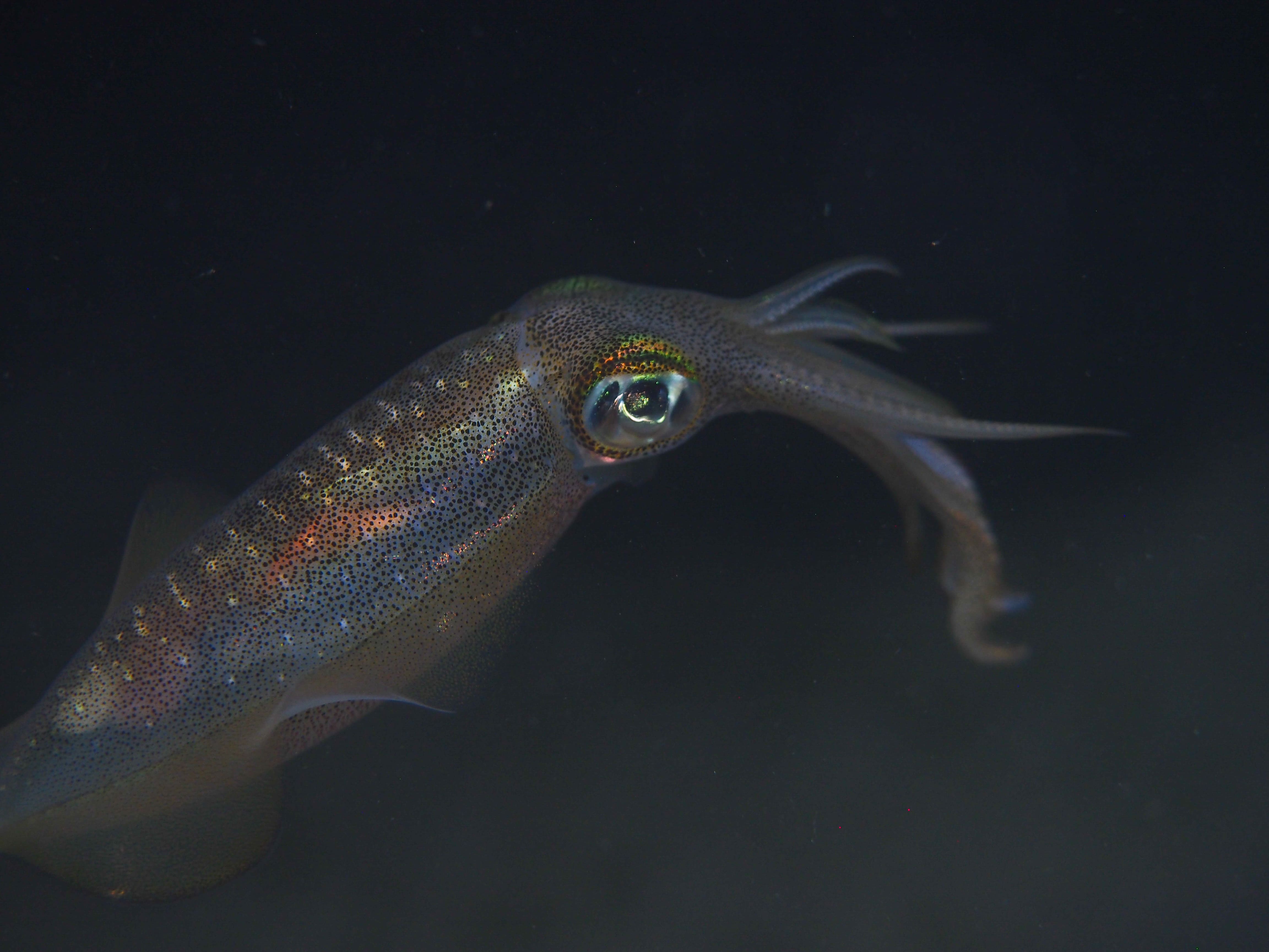 In the inky darkness, we floated like astronauts in space, surrounded by jellyfish, larval eels, and transparent juvenile squids. Many of these critters spend their early life stages drifting in the water column before settling down. Some looked alien—completely see-through or glowing faintly with bioluminescence. Every direction we turned, something tiny and weird pulsed or darted past.