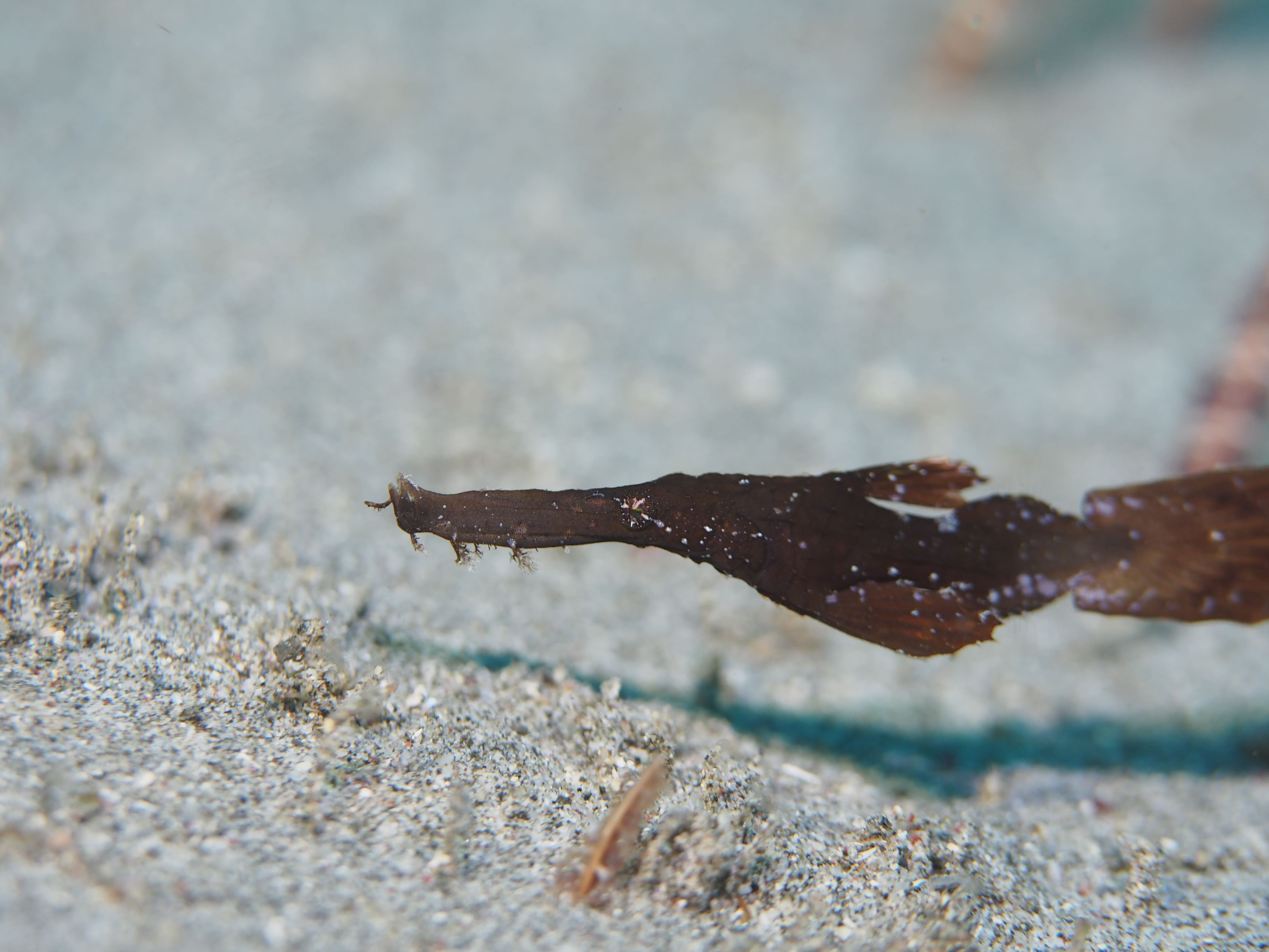We also saw several species of frogfish expertly disguised as a sponge. It took us several minutes to realize the “sponge” we were staring at was actually a predatory fish, waiting to ambush prey with its extendable mouth. Then there were the flying gurnards, flaring their massive, wing-like pectoral fins like underwater butterflies. We also saw another well camouflaged fish called the robust pipefish which looks like a blade of floating seagrass. I was taking photos of it and David was confused because he didn’t realize what it was, that is how well it camouflages.