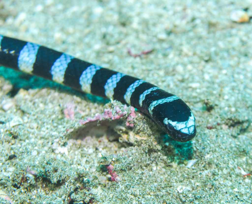 On shallower coral reef dives, we encountered a banded sea krait, a sea snake known for its potent venom but generally docile demeanor. It swam lazily between coral heads, ignoring us completely. David was especially excited for this sighting because it was his first encounter to see one of these beautiful animals.